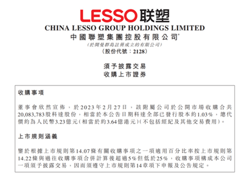 2月27日,科達制造股價高開高走,最終收報16.38元/股,大漲8.33%,成交額14.84億,較往日明顯放量。27日晚間,中國聯塑一紙公告激起資本市場熱議。公告顯示,僅2月27日當天,其全資子公司廣東聯塑即購入20,083,783股科達股份,相當于科達全部已發行股本約1.03%,耗資約為人民幣3.23億元。此舉也被投資者普遍認為是科達制造當日大漲的重要誘因。