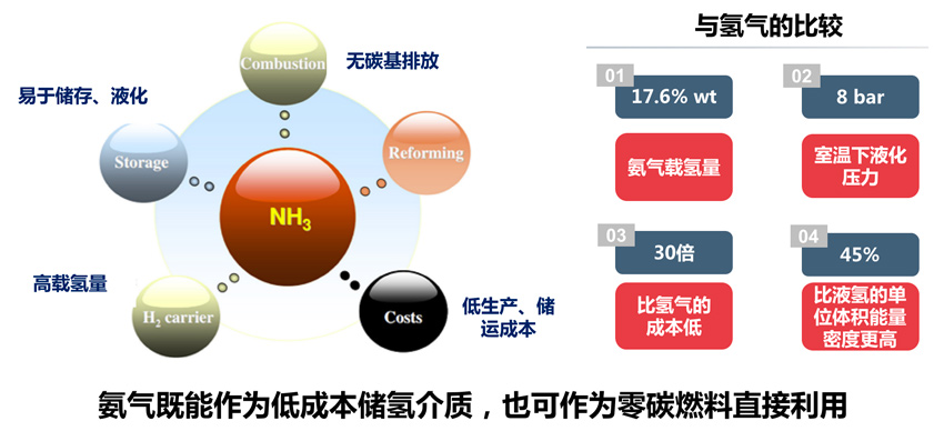 與氫氣相比,氨氣在低壓和-33℃的條件下很容易被液化,液態氨的能量密度高于液態氫,氨的體積能量密度幾乎是氫的2倍,使其運輸和儲存更具能效。從成本角度分析,氨氣生產成本略高于氫氣,但包括運輸和存儲在內的綜合成本則遠低于氫氣,存儲15天比氫氣便宜50%,存儲182天比氫氣便宜5倍以上。