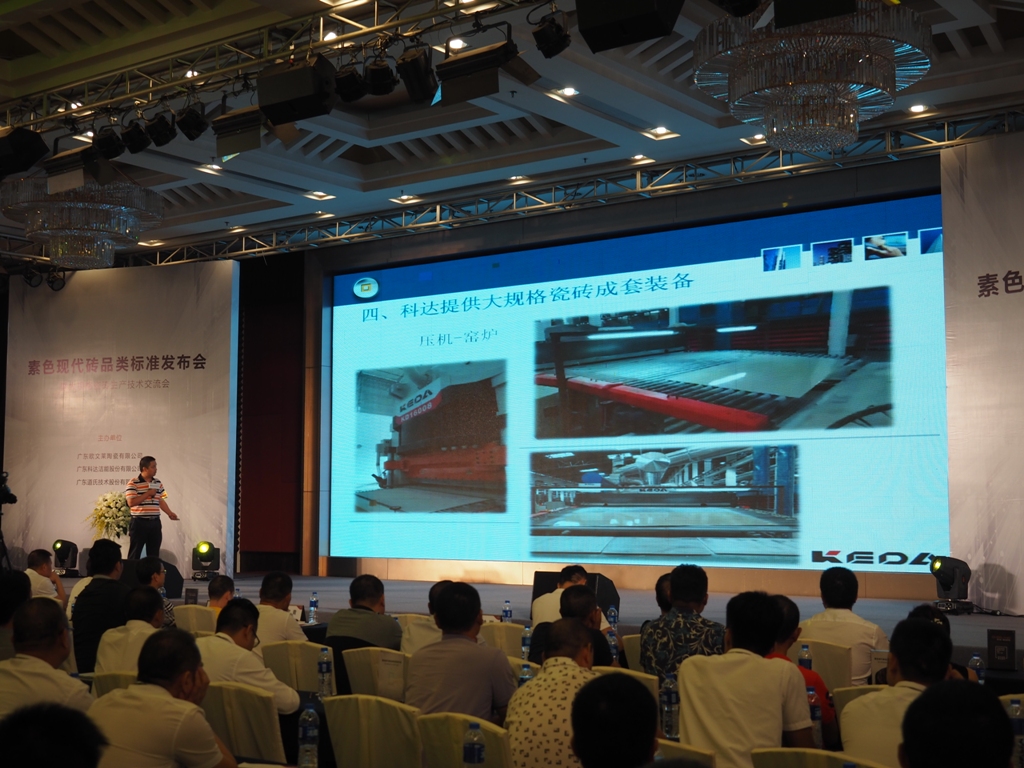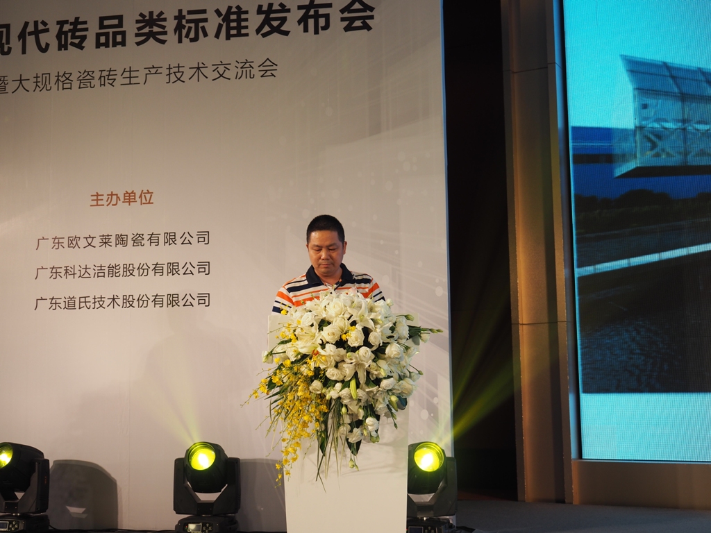 9月11日,“素色現代磚品類標準發布會暨大規格瓷磚生產技術交流會”在佛山皇冠假日酒店隆重舉行,廣東歐文萊陶瓷陶瓷有限公司聯合廣東科達潔能股份有限公司、廣東道氏技術股份有限公司發布了《素色現代磚品類標準》,并與行業嘉賓共同探討了大規格瓷磚的技術創新和發展趨勢,科達國內營銷總監鐘琳受邀出席并做主題演講。