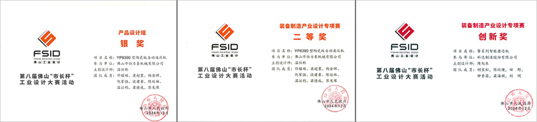 在此次大賽中,科達制造及其子公司恒力泰機械榮獲多項設計大獎。其中,科達制造擎系列智能磨邊機榮獲“裝備制造產業設計專項賽創新獎”,子公司恒力泰機械研發的YP8390型陶瓷板自動液壓機同獲“產品設計組銀獎”和“裝備制造產業設計專項賽二等獎”,YPL2000型鋁型材擠壓機則喜提“裝備制造產業設計專項賽三等獎”。