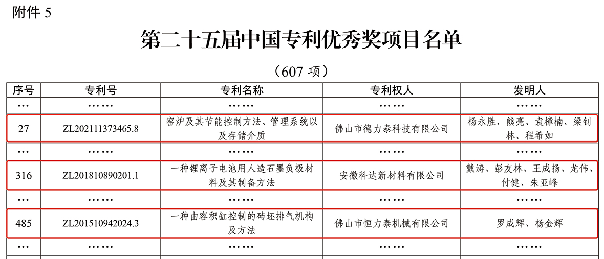 其中,恒力泰機(jī)械的《一種由容積缸控制的磚坯排氣機(jī)構(gòu)及方法》、德力泰科技的《窯爐及其節(jié)能控制方法、管理系統(tǒng)以及存儲(chǔ)介質(zhì)》、安徽科達(dá)新材料的《一種鋰離子電池用人造石墨負(fù)極材料及其制備方法》獲第二十五屆中國(guó)專利優(yōu)秀獎(jiǎng)。