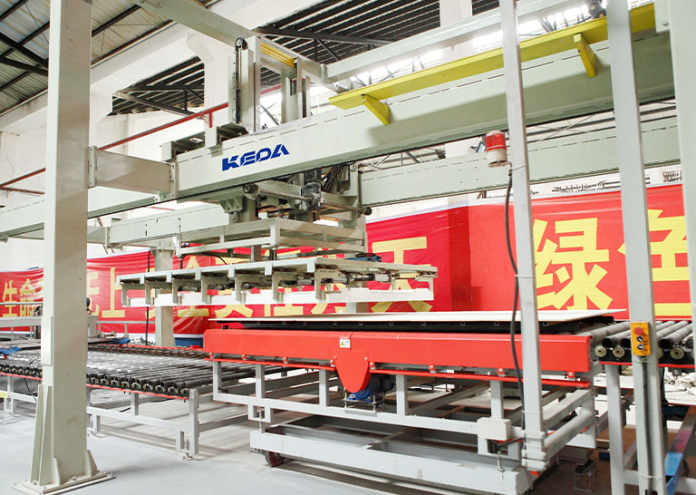 獨特的卸板機巧妙地將窯尾自動拆圍板和卸板融為一體:拆圍板機械手將圍板整體拆除后,窯具載著產品到卸板機械手下方,機械手下降夾住產品兩側并提升前移,將產品放入送板輥臺。同時拆圍板機械手將圍板放入空棚板上。