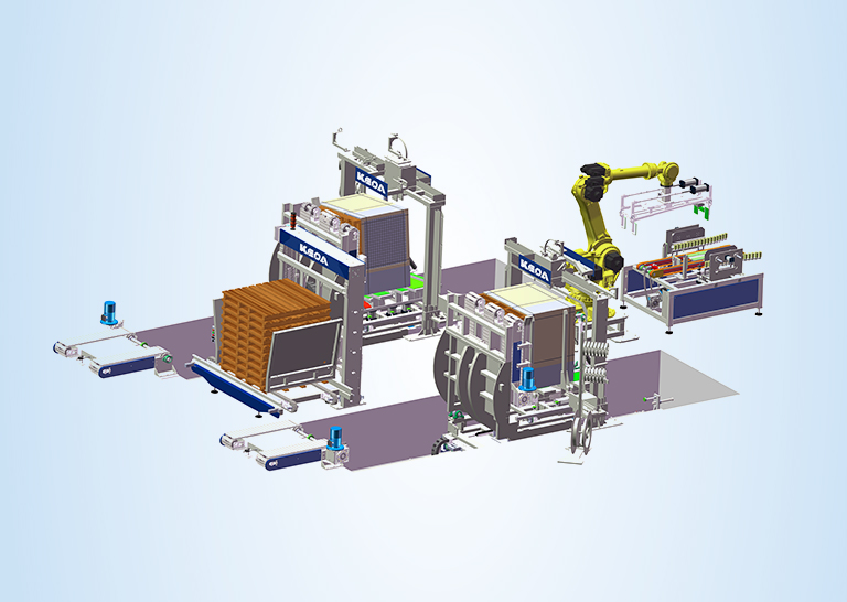 系統集成臥托式碼包機、自動捆托機、自動托盤庫及鏈式輸送線, 能實現高效完成多種規格的進倉托、口字托等碼垛,自動取送托盤 及物流輸送的智能碼垛 , 采用模塊式設計能對接 AGV 等智能輸送設 備,完成包裝、碼垛、倉儲物流及出貨裝車自動化。