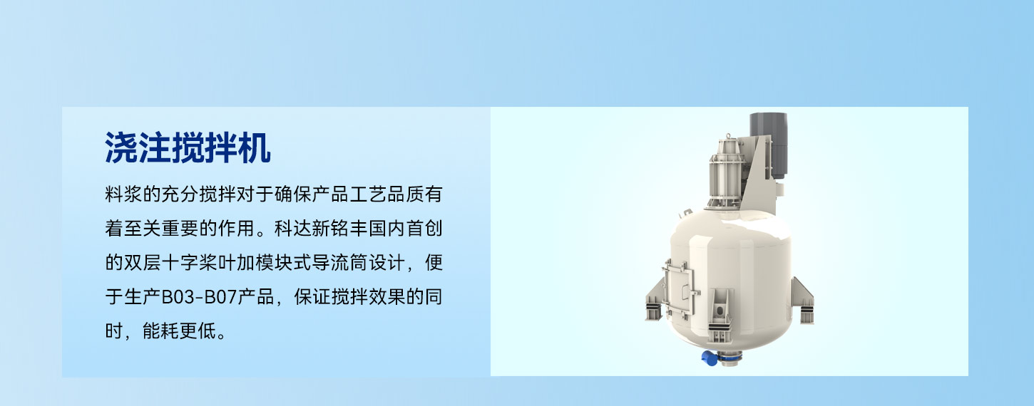 料漿的充分攪拌對于確保產品工藝品質有著至關重要的作用。科達新銘豐國內首創的雙層十字槳葉加模塊式導流筒設計,便于生產B03-B07產品,保證攪拌效果的同時,能耗更低。