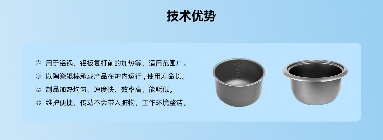 ◎ 用于鋁鍋、鋁板復打前的加熱等,適用范圍廣。 ◎ 以陶瓷輥棒承載產品在爐內運行 , 使用壽命長。 ◎ 制品加熱均勻、速度快、效率高,能耗低。 ◎ 維護便捷,傳動不會帶入臟物,工作環境整潔。