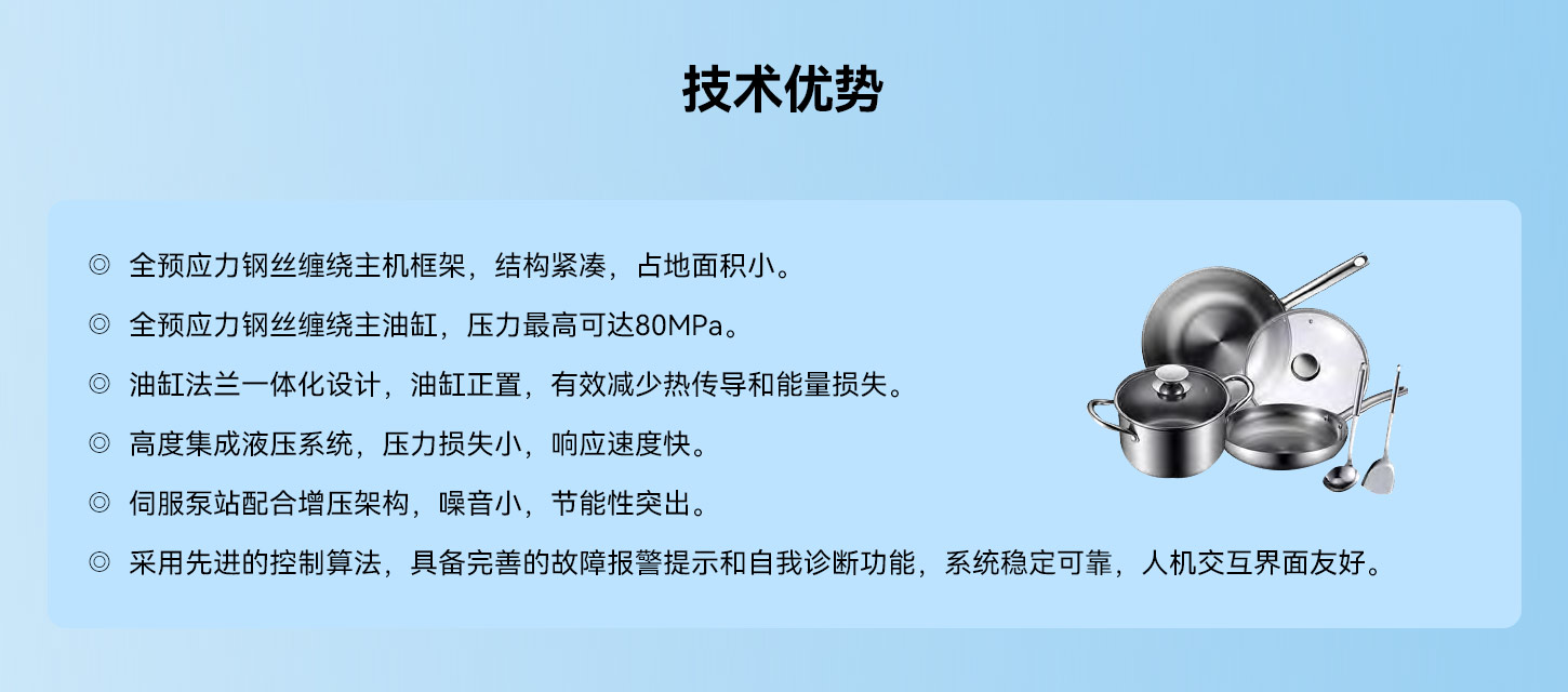 ◎ 全預應力鋼絲纏繞主機框架,結構緊湊,占地面積小。 ◎ 全預應力鋼絲纏繞主油缸,壓力最高可達 80MPa。 ◎ 油缸法蘭一體化設計,油缸正置,有效減少熱傳導和能量損失。 ◎ 高度集成液壓系統,壓力損失小,響應速度快。 ◎ 伺服泵站配合增壓架構 ,噪音小,節能性突出。 ◎ 采用先進的控制算法,具備完善的故障報警提示和自我診斷功能,系統穩定可靠,人機交互界面友好。