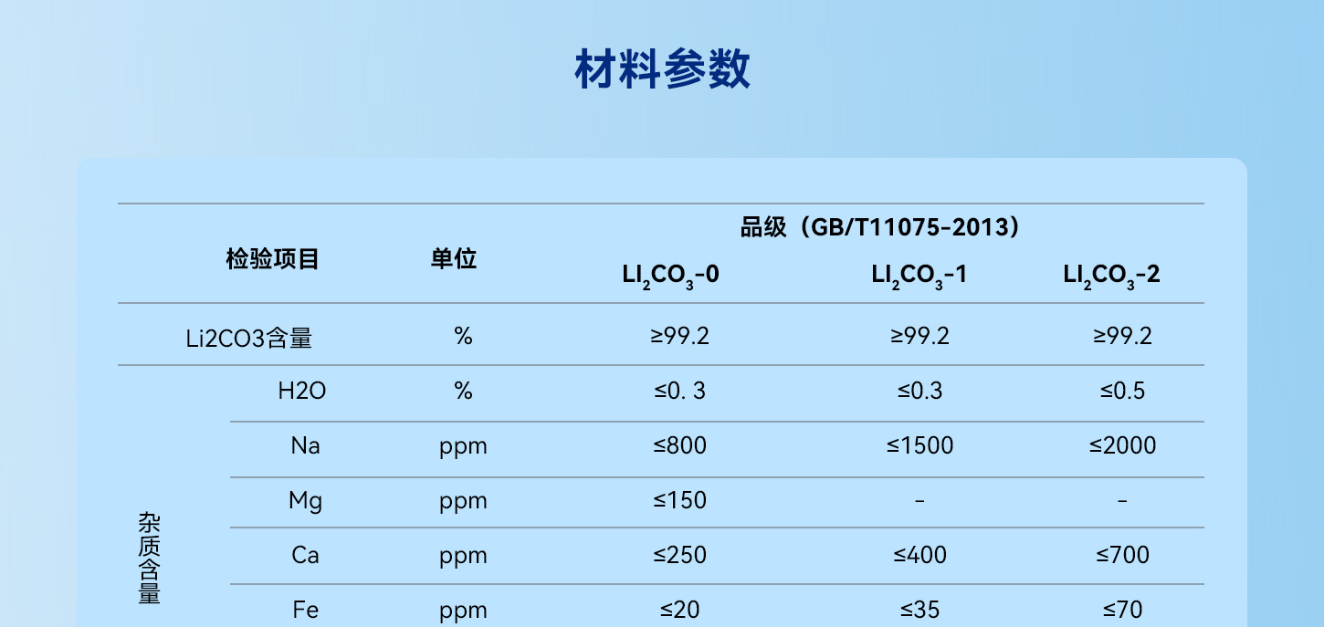 化學式:Li2CO3 分子量:73.89 CAS-No.:554-13-2 密度:2.11g/cm3 熔點:720℃ 沸點:1230℃
